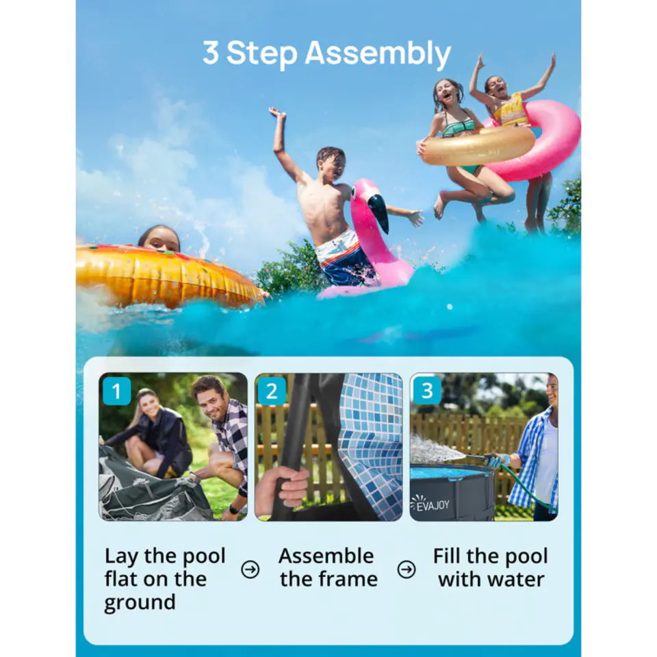 - Easy 3 Step Assembly: Enjoy a splashing good time with your family and friends all summer long in only 3 steps: simply lay the pool on the flat ground, assemble the frame, and fill the pool with water